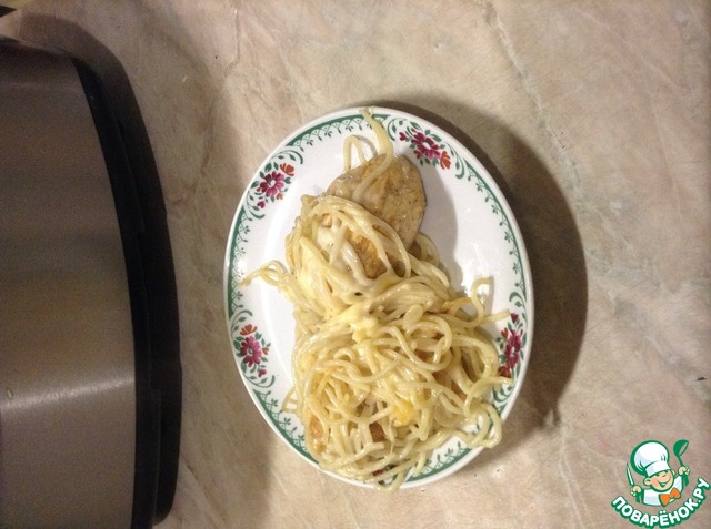 Уложить грудки с макаронами в чашу мультиварки (чашу смазать маслом).