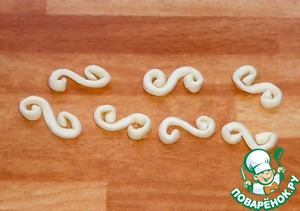 Несколько полосочек теста разрезать на 3 - 4 части и сделать украшения, как показано на фото.
