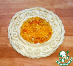 Затем одну спираль из теста сформировать в виде кольца и выложить на середину слойки.