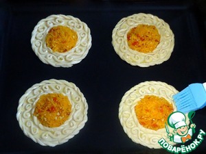 Слойки перенести на противень, смазанный растительным маслом и смазать растопленным сливочным маслом. Примечание: слойки лучше украшать сразу на противне.