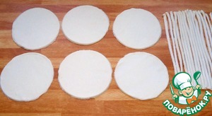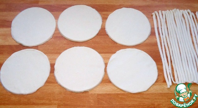 Большую часть теста раскатать толщиной 3 мм. и с помощью формы вырезать круги. Остальное тесто нарезать на тонкие полоски.