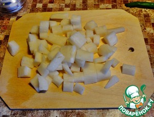 Помытый и почищенный дайкон нарезать кубиками.