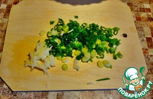 Зелёный лук нарезать мелко, чеснок тоже измельчить.