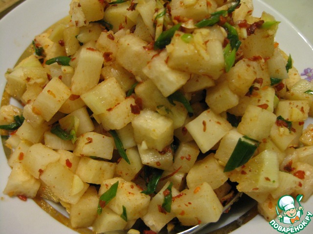 Наверное уже все знают, что корейская кухня отличается остротой вкуса своих холодных закусок. Вот ещё один вариант острого салатика из дайкона. Любителям должно понравится.