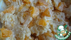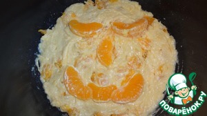 Чашу мультиварки слегка смазать растительным маслом и присыпать сухарями. Выложить в нее получившуюся массу, сверху разложить дольки мандаринов.