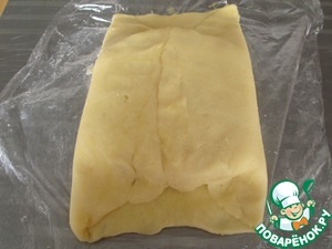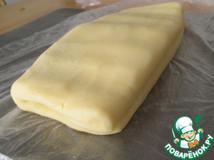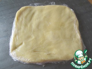 Слоеное бездрожжевое тесто можно брать уже готовое, а можно приготовить. Приведенный ниже рецепт теста (называемый слоеное тесто "наоборот") самый удачный из всех, что я пробовала, т. к. при нем исключена возможность вытекания масла. Итак, приготовим тесто N°1 - смешать 185 гр размягченного сливочного масла с 75 гр муки до однородного состояния. Раскатать в прямоугольник толщиной 1-0,5 см, я раскатывала между двумя пищевыми пленками для облегчения процесса. Завернутое в пленку тесто положить в холодильник на 1,5 часа минимум.