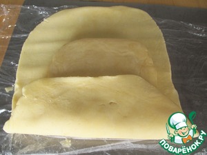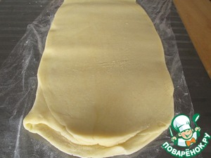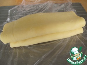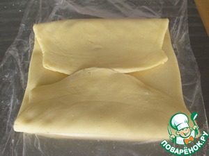 Охлажденный прямоугольник положить вертикально не скрепленной стороной справа. Не много прихлопнуть поверхность теста сверху скалкой. Полностью повторить шаги 5,6,7,8 два раза.