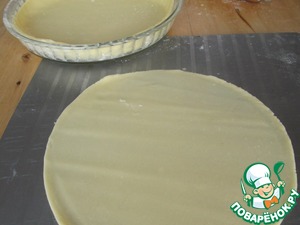 Готовое тесто раскатать в пласт 2 мм и вырезать два круга - один больше диаметра формы, второй чуть меньше (диаметр моей формы 36 см). Больший круг поместить в промасленную и присыпанную мукой форму, формируя бортики примерно 2-3 см. Все поместить в холодильник. Обрезки теста сохранить.