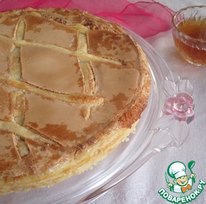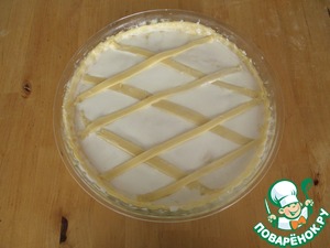 Края меньшего круга из теста смазать водой. Положить его поверх начинки, края хорошо скрепить с основой. Поверхность покрыть глазурью. Из обрезков теста вырезать полоски и украсить ими пирог.