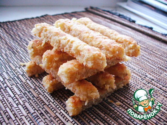 Разогреть духовку до 220С. Тесто раскатать в прямоугольник толщиной примерно 4 мм, нарезать полосками шириной 2-3 см. Переложить на противень и выпекать 10-15 мин.
