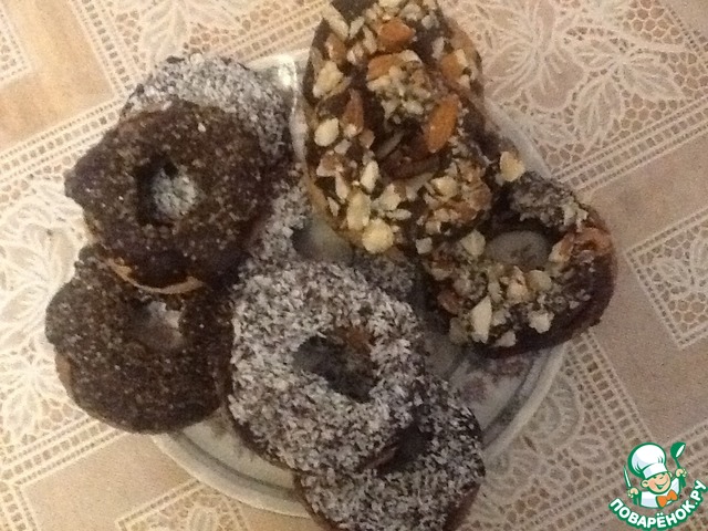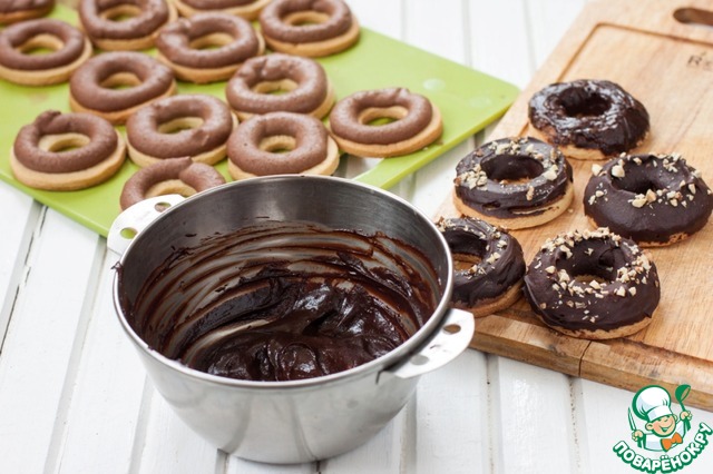 Соединить в кастрюльке сливки, воду и глюкозу. Глюкозный сироп нужен для блеска, я его заменила медом. Довести массу до кипения и залить нарубленный шоколад, размешать до полного растворения. Немного охладите, чтобы масса была не горячей, но оставалась теплой и окуните каждое печенье верхней стороной в глазурь. Она застывает очень быстро, поэтому дробленными орешками нужно посыпать сразу же каждое печенье. Я посыпала крупными гранулами коричневого сахара и орешками, можно использовать также кокосовую стружку или какао.