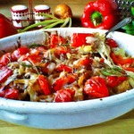 3. Нагреть духовку до 180 гр. Картофель выложить в смазанную жиром форму. Разложить слоями овощи и сырно-сливочную массу. Завершить слоем сладкого перца и лука. Сверху выложить кусочки сыра. Запекать в духовке около 45 мин.