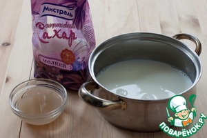 Всыпьте сахар в молоко и поставьте его на огонь. Когда молоко нагреется, добавьте агар и доведите молоко до кипения. Варим, помешивая, несколько минут, пока агар-агар полностью не растворится. В этом отличие агар-агара от желатина, который кипятить нельзя ни в коем случае. -