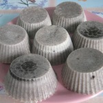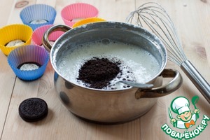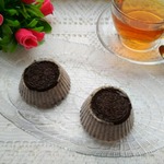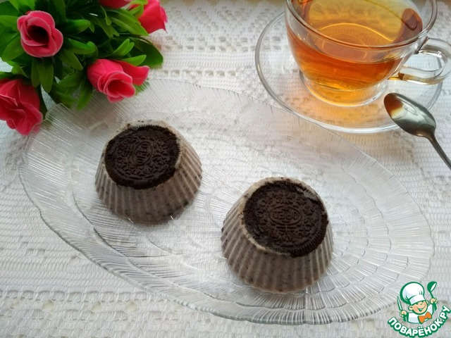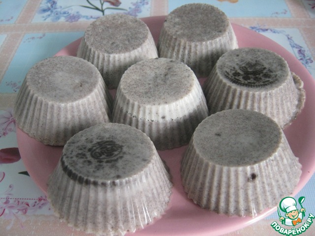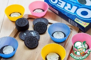 Пока нагревается молоко и варится агар, разъедините половинки печенья. Одну половинку, смазанную кремом, положите в силиконовые формочки надписью вниз