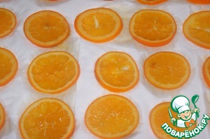 Вскипятить воду и растворить в ней 50 г сахара. Довести до кипения и поместить в сироп апельсины. Варить 10 минут. Поместить готовые апельсины на бумажное полотенце и хорошо обсушить.