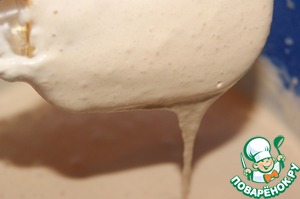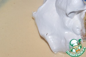 В отдельной емкости взбить в пену 4 желтка, добавить масло 50 г и молоко, опять взбить. Добавить муку 100 г, 1 г ванили и взбить венчиком. Вввести в три приема взбитые белки, перемешивая лопаточкой снизу вверх и по кругу