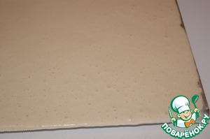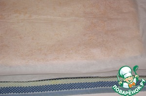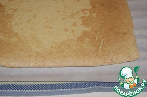 Поместить бисквит вместе с бумагой на полотенце, накрыть чистой бумагой сверху.