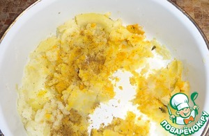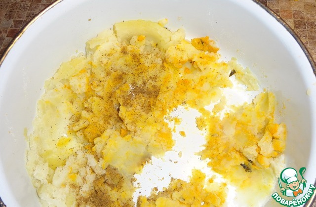 Поставить варить картофель прямо в мундире. После того, когда он сварится, быстро очистить и размять толкушкой.