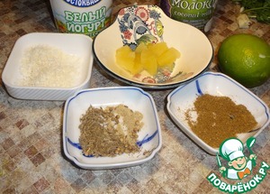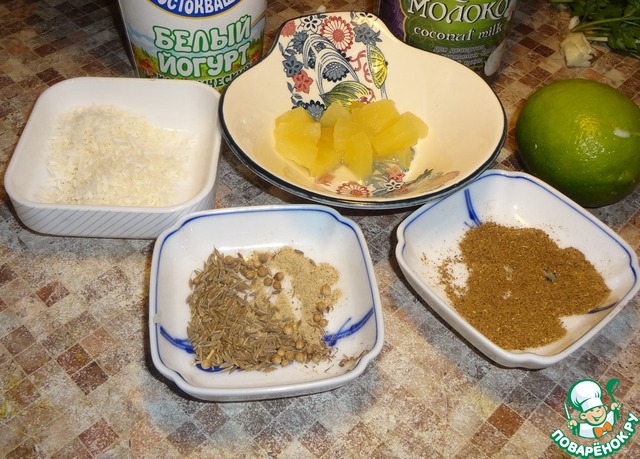 Для приготовления соуса я взяла йогурт, 3ст. л. консервированного ананаса, кокосовую стружку, немного натёртого имбиря и сока лайма. Нарезала туда же свежей зелени (петрушка, мята, кориандр) и пробила всё это ручным блендером.