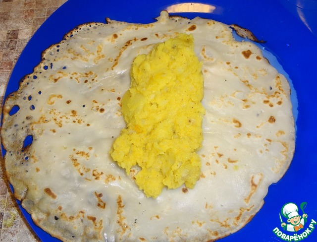 На бледную, не поджаренную сторону положить приготовленный ранее картофель и завернуть блин треугольником или просто закатать в рулет.