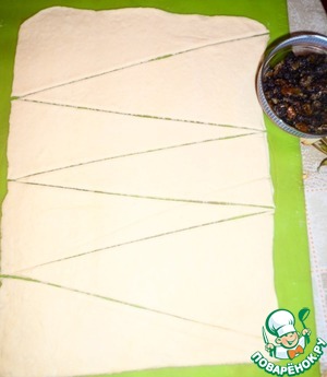 Раскатать слоеное тесто толщиной примерно 4 мм и нарезать треугольники.