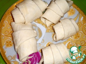 ... и свернуть рогалик (сначала завернуть уголки внутрь, затем свернуть рогалик). Выпекать рогалики в духовке при температуре 180 градусов до зарумянивания (примерно 20-25 минут). Наши слоеные рогалики готовы. Приятного аппетита!