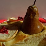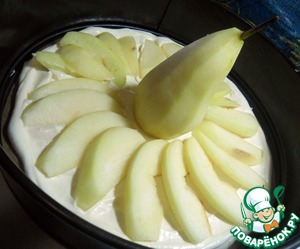 Груши очистите от кожуры, сохранив у одной «хвостик». Грушу с "хвостиком" оставьте целой, а вторую грушу разрежьте на дольки. Форму застелите бумагой для выпечки и выложите небольшую часть теста. В центре поместите грушу с хвостиком, а вокруг разместите нарезанную грушу.