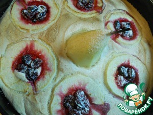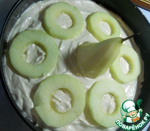 Поверх груш выложите оставшееся тесто. Яблоко очистите от кожуры и сердцевины, нарежьте кружками. Уложите яблоки на тесто.