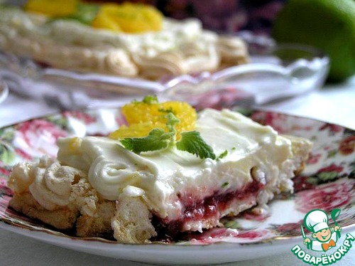 Перед Вами вариант торта-безе "Павлова" в необычной прямоугольной форме. В составе: французская лаймовая меренга, домашний малиновый джем и нежный лимонно-имбирный крем из маскарпоне. Это восхитительное и невероятно вкусное сочетание, попробуйте ;) P.S.: Я готовила полпорции под размер блюда для подачи.