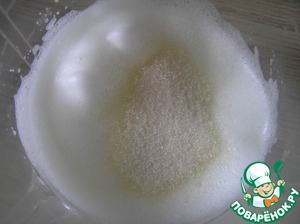 Приготовить французскую меренгу. Белки взбить со щепоткой соли до мягких волн. Постепенно добавлять мелкий коричневый сахар,