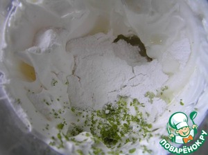 Взбить массу до устойчивых форм пик (проверка: перевернув емкость, масса не должна из неё выпасть). Добавить сахарную пудру, сок и цедру лайма.