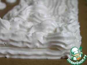 Выложить меренгу в форму 12х35х2 см (если таковой нет, то нарисовать на бумаге для выпечки нужный размер и отсадить меренгу из кондитерского мешка). Выпекать при 150*С 25-30 минут. Полностью остудить.