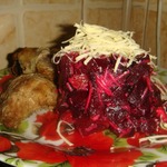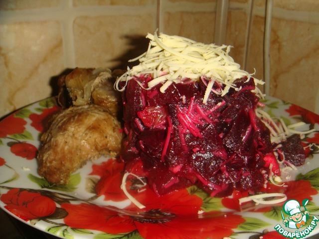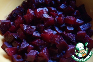 ... а свеклу остудить, почистить и нарезать кубиками. Положить слоем в плоский салатник. Присолить и поперчить.