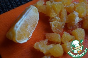 Апельсин почистить, разделить на дольки и снять с них кожицу. Дольки порезать небольшими кусочками.