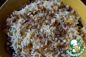Следующий слой - натёртый на мелкой тёрке сыр. Поверх него - крупно порубленные и рассыпанные в художественном беспорядке орехи.