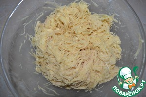 Картофель очистить от кожуры, потереть на мелкой тёрке, добавить муку, яйцо, посолить. Всё перемешать.