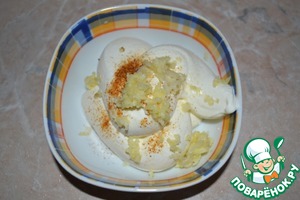 Для приготовления соуса в сметану добавить 3 зубчика раздавленного чеснока и красный кайенский перец. Всё тщательно перемешать