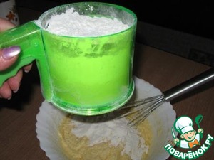 Муку смешать с разрыхлителем и постепенно вводить в тесто, перемешивая аккуратно венчиком.