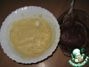 Готовое тесто разделить на две части, в одну добавить какао и перемешать.