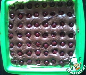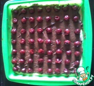 Сверху выкладываем вишню (я брала в собственном соку. Вишню предварительно нужно высыпать в сито, чтобы убрать лишний сок).