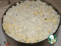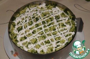 Поверх огурца выложить белки, смазать майонезом и посыпать желтками. Можно поверх огурца и слоя майонеза просто натереть яйца. |