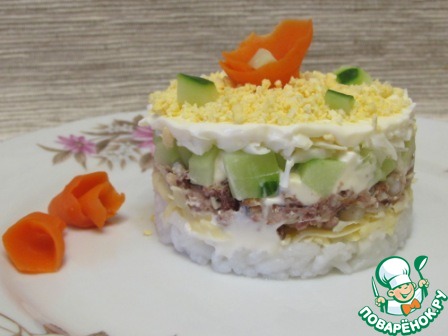Рис отварить в подсоленной воде, промыть, остудить. Выложить на дно салатника, нанести сеточку из майонеза. |