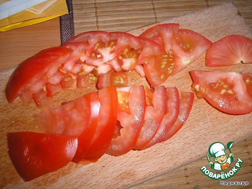 Режем помидорчик сначала колечками, потом на четвертинки.