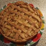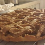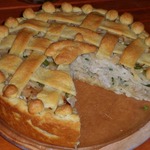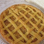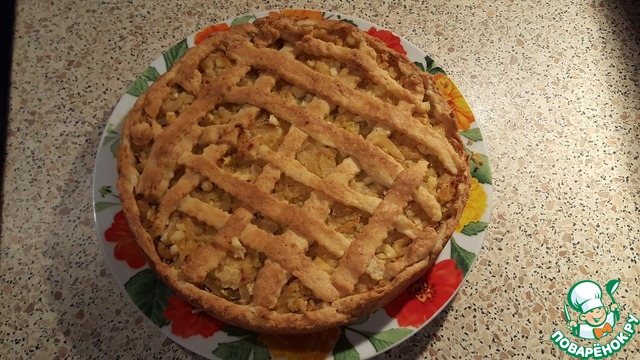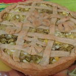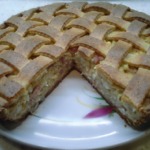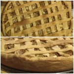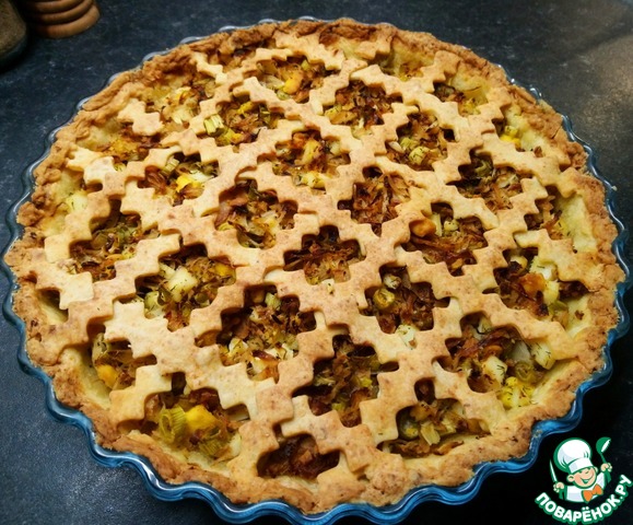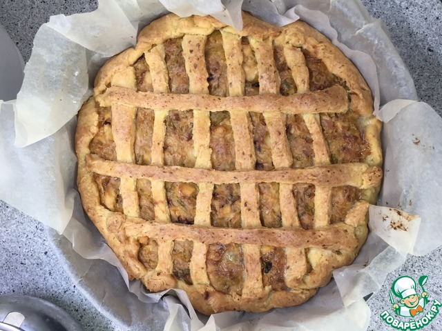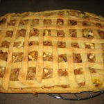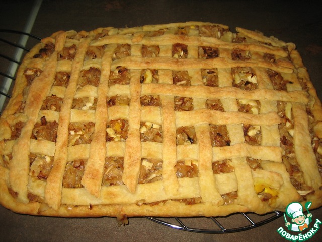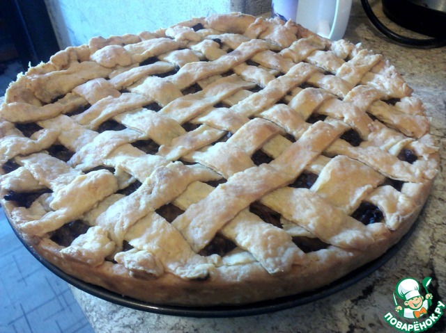 Оставшееся тесто тонко раскатать, нарезать на полоски и выложить в виде решетки. Выпекать при 180*С до готовности.