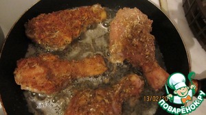 • Нагреваем масло на сковороде. Обваливаем голень в яичной смеси, затем в панировочных сухарях. Немного их обжариваем с двух сторон до румяной корочки.