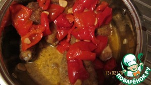 • Достаем их, переворачиваем и выкладываем на них перцы маринованные. Закрываем фольгой и протыкаем фольгу ножом в нескольких местах. Снова в духовку до готовности, где-то 30-40 минут.
