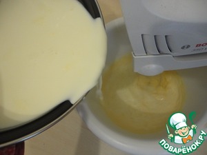Медленно влить молоко в желтковую массу, постоянно перемешивая.