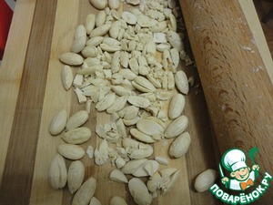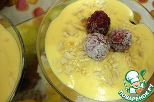 Затем заварной крем, немного миндаля и по 3 малинки.