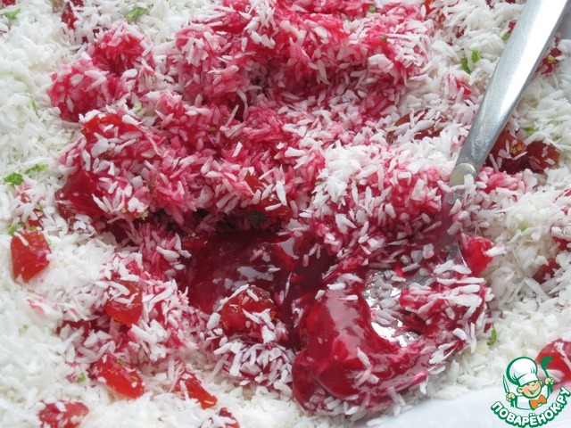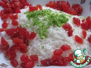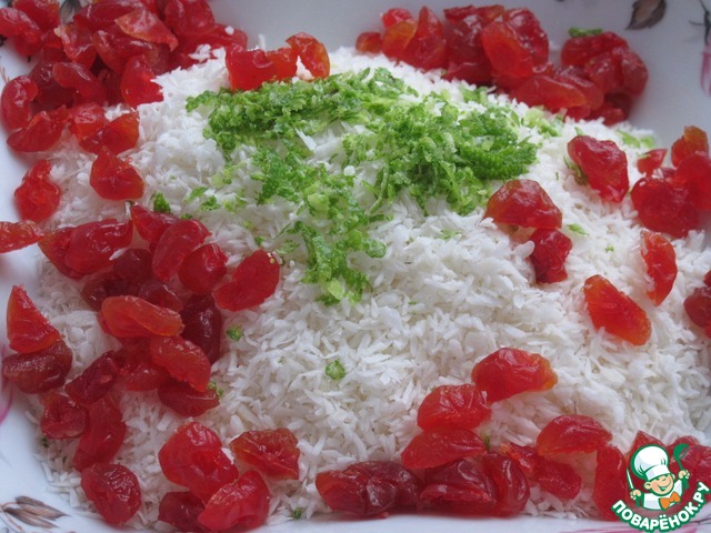 Кокосовую стружку, вишню, цедру лайма сложим в глубокую тарелочку.