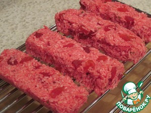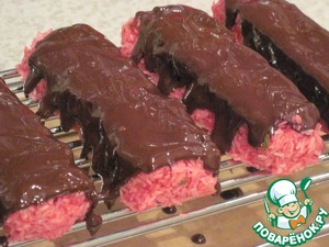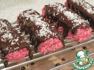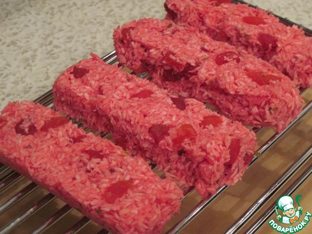 Затем достанем кокосово-вишневую массу из морозильника, извлечем из формы и осторожно нарежем острым ножом на прямоугольники. Уложим полученные батончики на решетку, подстелив под нее бумагу. Масса может немного осыпаться, все зависит от качества повидла, но это не страшно, подправим ножиком и придадим правильную форму батончику.